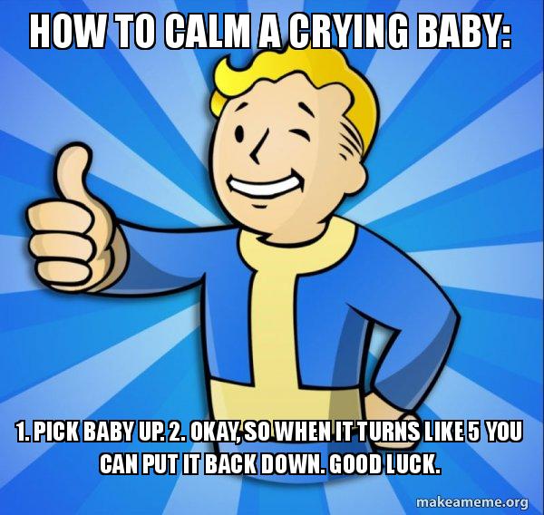 How To Calm A Crying Baby 1 Pick Baby Up 2 Okay So When It Turns Like 5 You Can Put It Back Down Good Luck Vault Boy Fallout 4 Game Make A Meme